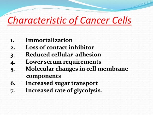 Characteristics of cancer cells cancer cells grow and divide at an abnormally rapid rate, are poorly differentiated, and have abnormal membranes, cytoskeletal proteins, and morphology. When hormones attach to hormone receptors, the cancer cells with these receptors grow. Cancer cells crowd out normal tissue. All of the following are characteristics of cancer cells except: These cells do not have the ability to transform into specialized cells. Is they actually ev a. The can enter the cell cycle multiple times. Um, cancer cells undergo a pop toes is no, they do not undergoing potatoes. A clinically detectable cancer contains a heterogenous population of cells, which originated from single clonal cell. For example, one protein called p53 has the job of checking to see if a cell is too damaged to repair, and if so, advise the cell to kill itself. Normal cells become cancerous when a series of mutations leads the cell to continue to grow and divide out of control, and, in a way, a cancer cell is a cell that has achieved a sort of immortality. Rapidly growing cancers often contain central area of ischemic necrosis because the cancer blood supply, derived from host is not enough to keep pace to the oxygent need of expanding mass of cancer cells. Cancer is a cellular disease.